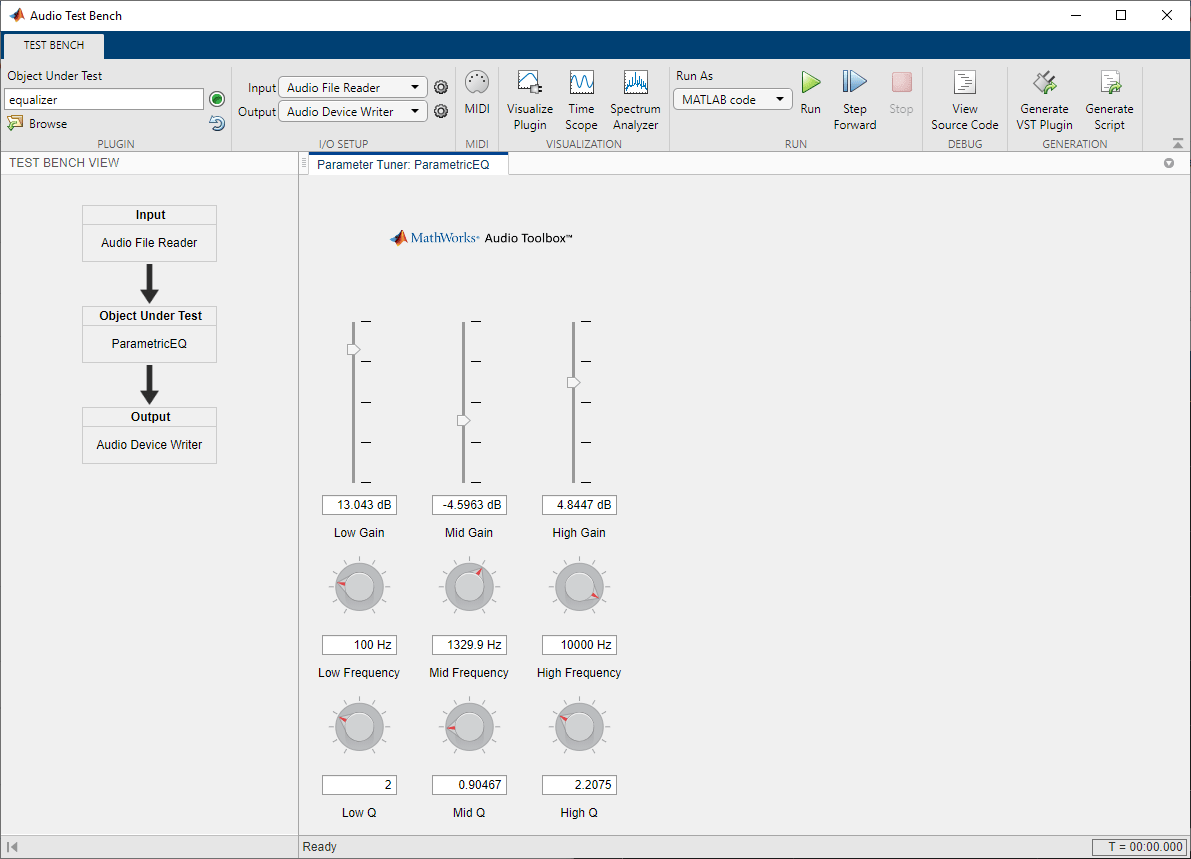 Any audio plugin can be tuned in real time using audioTestBench. The tool allows you to test an audio plugin with audio signals from a file or device. The tool also enables you to view the power spectrum and the time-domain waveform for the input and output signals.