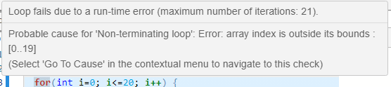 In the loop body, the run-time error typically occurs as an orange check of another type on an operation. The check is orange and not red because the operation typically passes the check in the first few loop iterations and fails only in a later iteration. However, because the failure occurs every time the loop runs, the Non-terminating loop check on the loop keyword is red.