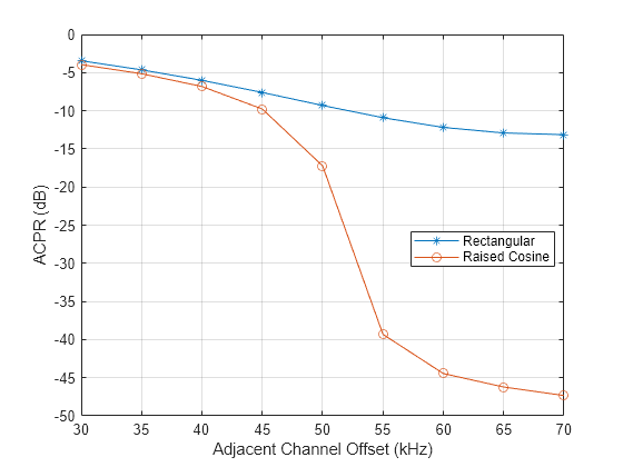 plot(freqOffset/1000,ACPR1,'*-',freqOffset/1000, ACPR2,'o-') xlabel('Adjacent Channel Offset (kHz)') ylabel('ACPR (dB)') legend('Rectangular','Raised Cosine','location','best') grid