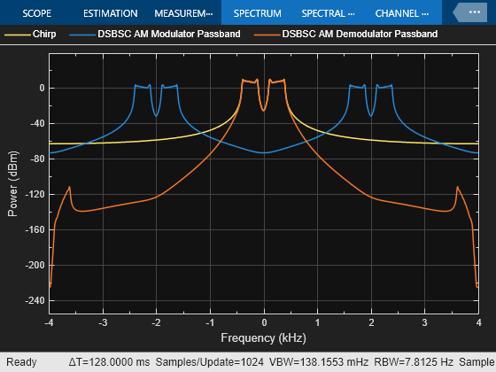 The DSBSC AM Modulator Passband block transmits the lower and upper sideband signal. For an input signal u(t), as a function of time t, the output is