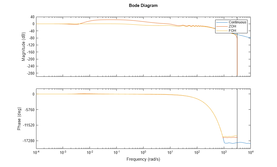 The accuracy of simulations with internal delays increases as the sample time decreases. To gauge whether the selected time step size is small enough, you can compare the frequency domain response of the continuous model with the model discretized with that sample time. Discretize the system using zero-order hold (ZOH) and first-order hold (FOH) with Ts = 0.001.