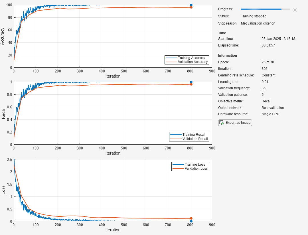 options = trainingOptions("sgdm", ... ValidationData={XValidation,YValidation}, ... ValidationFrequency=35, ... ValidationPatience=5, ... Metrics=["accuracy","recall"], ... ObjectiveMetricName="recall", ... OutputNetwork="best-validation", ... Plots="training-progress", ... Verbose=false);
