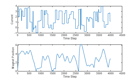 For the training data, the predictors positionTrain and currentTrain contain the 1st to 2399th data points of the magnet position and current respectively, while the targets TTrain contain the 3rd to 2400th data points of the magnet position.