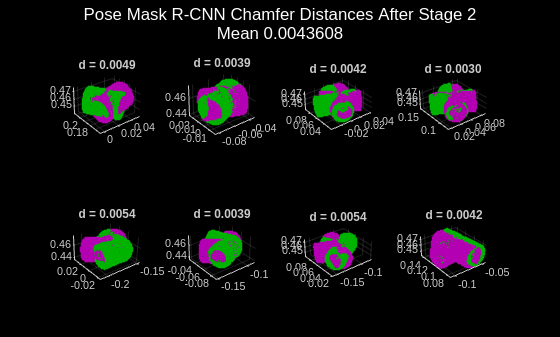 In this example, you perform 6-DoF pose estimation in three stages using a pretrained Pose Mask R-CNN network, which is a type of convolutional neural network designed for 6-DoF pose estimation [1][2]. You first train the network on an instance segmentation task to predict bounding boxes, class labels, and segmentation masks. Then, you train the network on a pose estimation task to predict 3-D rotation and translation for detected objects. To refine initial pose predictions and evaluate the results against the ground truth pose, you visualize the network predictions and apply geometry-based postprocessing. In the third stage, you train this trained model again to refine the rotation predictions for enhanced accuracy.
