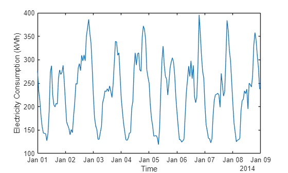 This example uses a preprocessed version of the Electricity Load Diagrams data set available in the UCI Machine Learning Repository [2] and licensed under CC BY 4.0. The original data set contains values in kW of 370 clients, logged every 15 minutes from 2011 to 2014. The subset contains the hourly electricity consumption (in kWh) from January 1st 2014 to September 8th 2014, partitioned into training, validation, and test sets. Missing data is represented by NaN values. The data is approximately 10MB in size. Download the data from the MathWorks website.