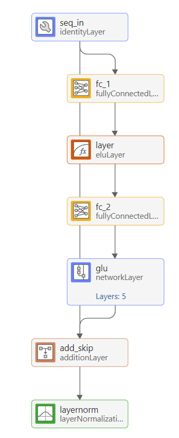 TFTs use gated residual networks (GRN) for nonlinear processing. These consist of fully connected layers with exponential linear unit (ELU) activations, and a gated skip connection using a GRU. To view an example of a GRN, double-click on the static_context_varselect layer in Deep Network Designer.