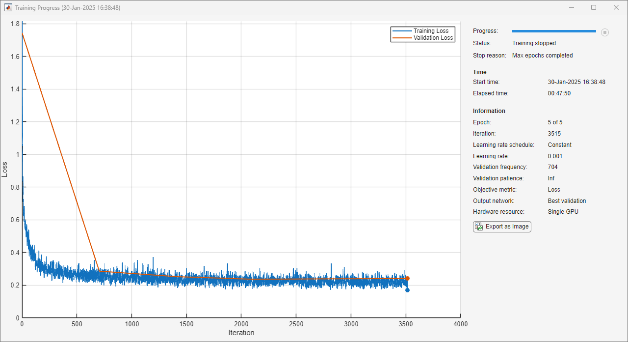 minibatchsize = 64; validationFrequency = ceil(numTrainSamples/minibatchsize); options = trainingOptions("adam", ... MaxEpochs=5, ... MiniBatchSize=64, ... InitialLearnRate=0.001, ... GradientThreshold=0.01, ... Shuffle="every-epoch", ... ValidationData=dsValidation, ... ValidationFrequency=validationFrequency, ... Plots="training-progress", ... Verbose=false);