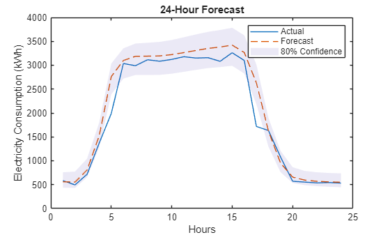 numTestSamples = size(samplesTest,3); sampleIdx = randi(numTestSamples); sampleToPlot = denormalizedTestTargets(:,:,sampleIdx); figure plot(sampleToPlot) hold on p10 = denormalizedTestPredictions(:,1,sampleIdx); p50 = denormalizedTestPredictions(:,2,sampleIdx); p90 = denormalizedTestPredictions(:,3,sampleIdx); plot(p50, '--') patch([1:numFutureTimeSteps flip(1:numFutureTimeSteps)]', ... [p10;flip(p90)],1, ... EdgeColor="none",FaceAlpha=0.1,CDataMapping="direct") title("24-Hour Forecast") xlabel("Hours") ylabel("Electricity Consumption (kWh)") legend(["Actual" "Forecast" "80% Confidence"]) hold off