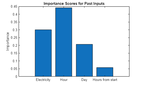 figure bar(medianPastImportance) title("Importance Scores for Past Inputs") ylabel("Importance") xticklabels(["Electricity" "Hour" "Day" "Hours from start"]);