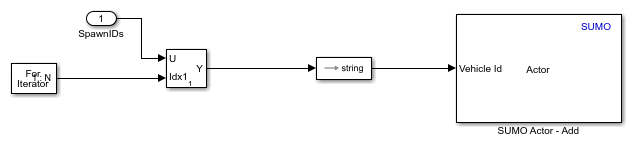 In this example, all SUMO vehicles use the same ID as in RoadRunner. The Actor Id of the ego vehicle in RoadRunner is 1, so the corresponding vehicle in SUMO has a Vehicle Id of ActorID "1". The Spawn Traffic subsystem spawns the RoadRunner vehicles in SUMO using the Actor block with Actor Id values of the vehicles. This process spawns vehicles randomly in SUMO. For more details, see Actor. Open the Spawn Traffic subsystem, located within the Spawn SUMO Traffic subsystem..