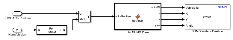 For all SUMO vehicles, the Reader block converts the Actor Id value from RoadRunner to a string scalar, and uses that value to read position, speed, and angle of the corresponding vehicle in the SUMO simulation.. The HelperUpdateRRFromSUMO System object uses the ActorSimulation object to write these values to RoadRunner. Open the Get Vehicle Pose subsystem.