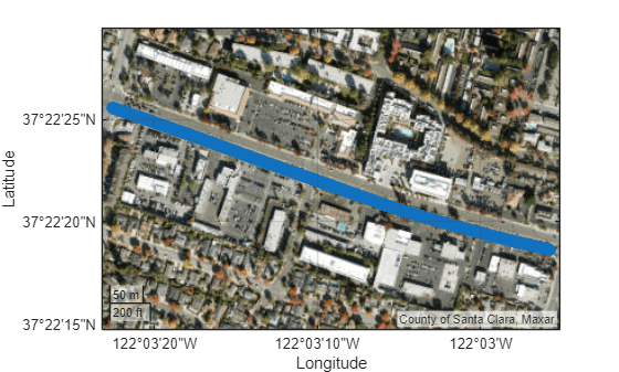 To demonstrate the selection of overlapping timestamps and synchronization, this example adds a fixed time offset of 10 seconds and increases the number of samples from 400 to 4000 in the GPS data. To make the GPS timestamps non-overlapping and non-synchronized with other sensor data, add a time offset and increase the sampling rate of the GPS data by using the helperAddOffsetAndSamplesToGPS