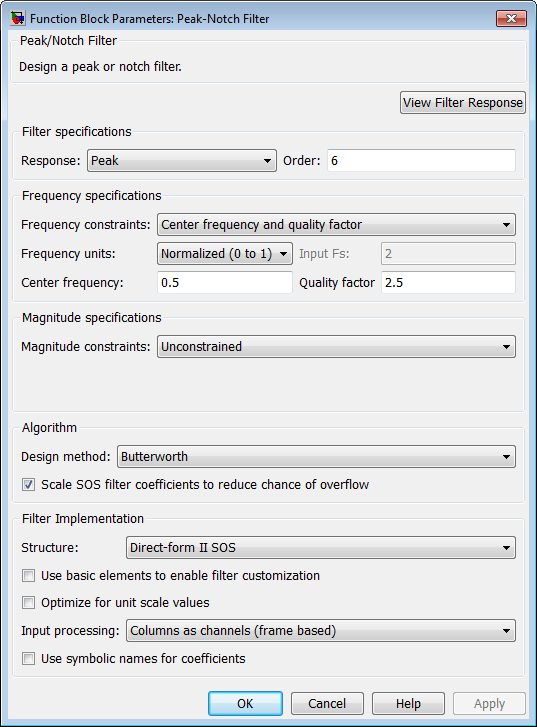 See Peak/Notch Filter Design — Main Pane for more information about the parameters of this block. The Data Types and Code Generation panes are not available for blocks in the DSP System Toolbox™ Filter Designs library.