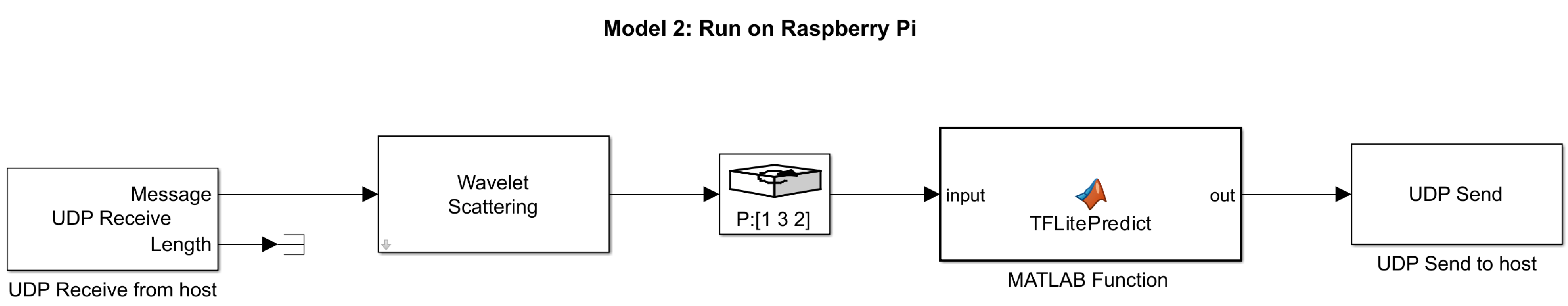 The model AirCompressorFaultDetectionTargetModel.slx runs on the target Raspberry Pi hardware. This model receives the air compressor sound data from the AirCompressorFaultDetectionHostModel using a UDP Receive block, extracts wavelet features from the audio data, passes the features to a TensorFlow Lite network to obtain classification scores, and sends back the scores to the AirCompressorFaultDetectionHostModel using a UDP Send block.