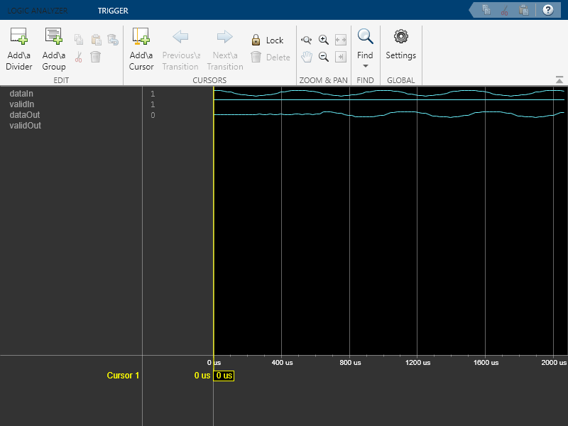 modifyDisplayChannel(la,3,'Name','dataOut','Format','Analog','Height',8)