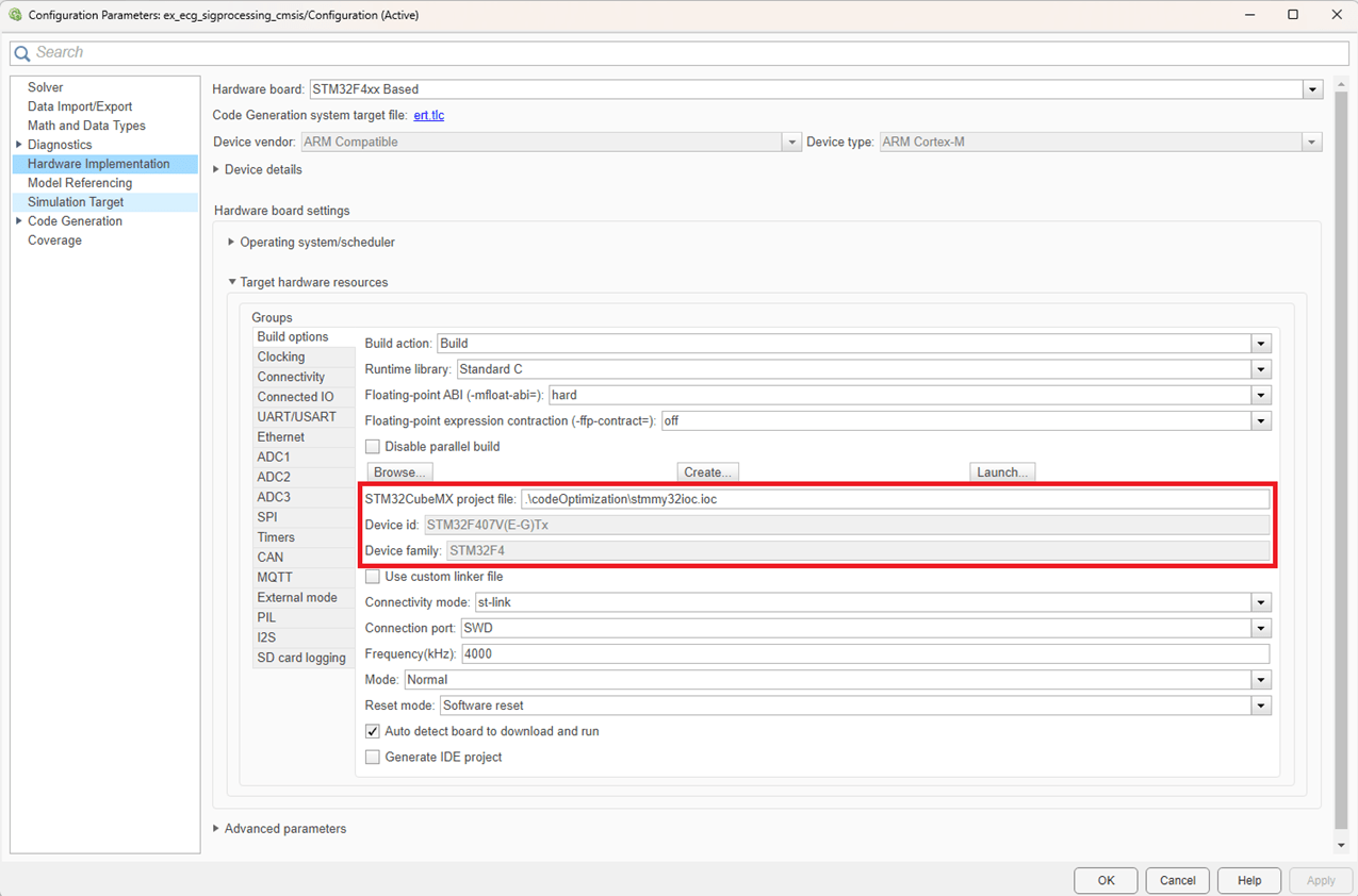 3. Set System target file to ert.tlc. Select Target hardware as STM32F4xx Based. Set Toolchain to GNU Tools for STM32.