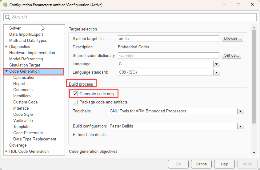 Ensure that you select the Generate Code Only option in Configuration Parameters > Code generation > Build process category.