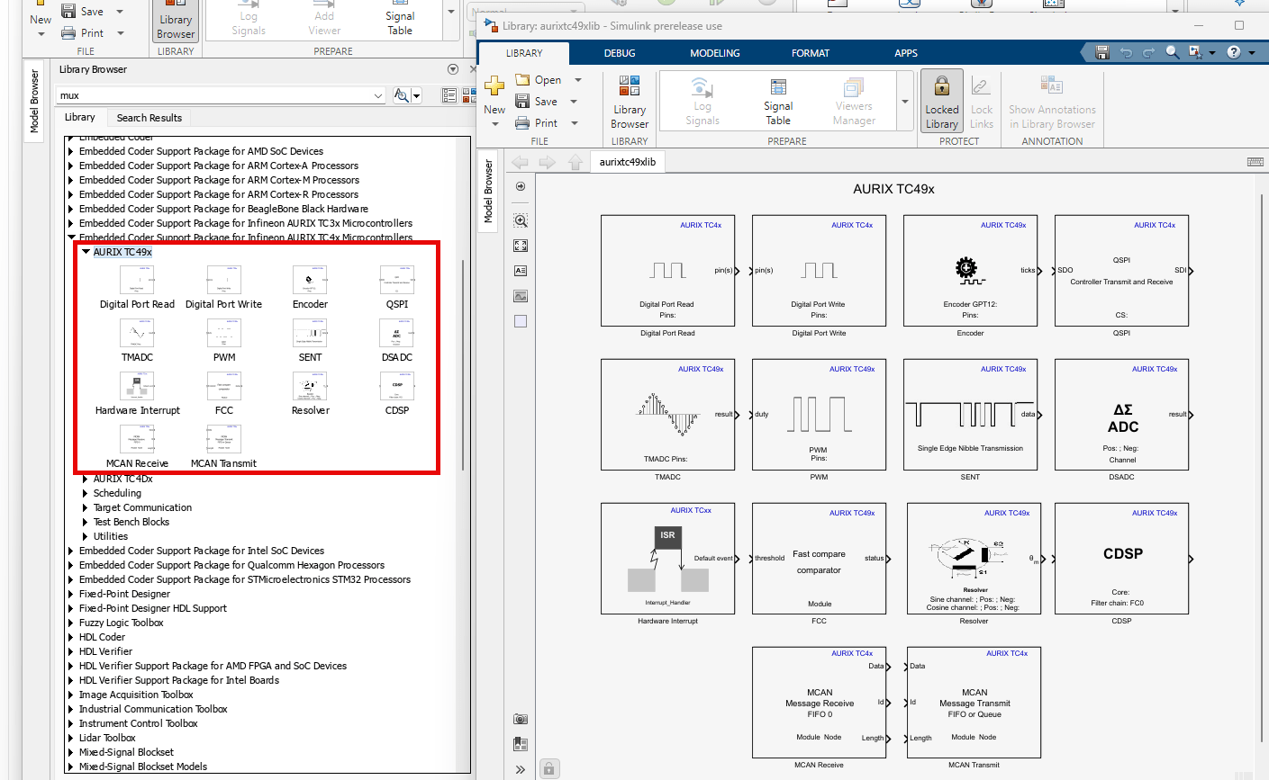 Embedded Coder Support Package for Infineon AURIX TC4x Microcontrollers enables you to create algorithms by using the blocks that you can add to your Simulink® model. The blocks are used to configure the associated sensors and actuators, as well as to read and write data to sensors and actuators.