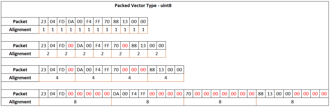 For processors such as Texas Instruments® C2000™, with a smallest addressable memory cell of 16 bits per char, consider a packed input vector data type uint8. The output packet occupies 16 bits although the data value that the packet represents is 8 bits. The byte alignment values are calculated with respect to the 16-bit addressable memory.