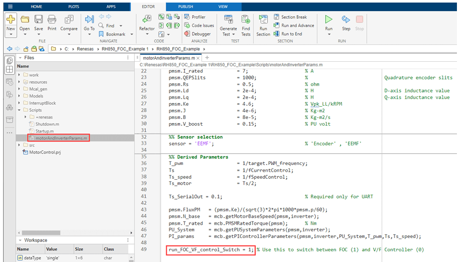 2. In the motorAndInverterParams.m file, set the value of run_FOC_VF_control_switch to 1.