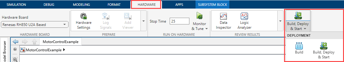 4. Click Build, Deploy & Start on the Hardware tab to deploy the target model to the hardware.