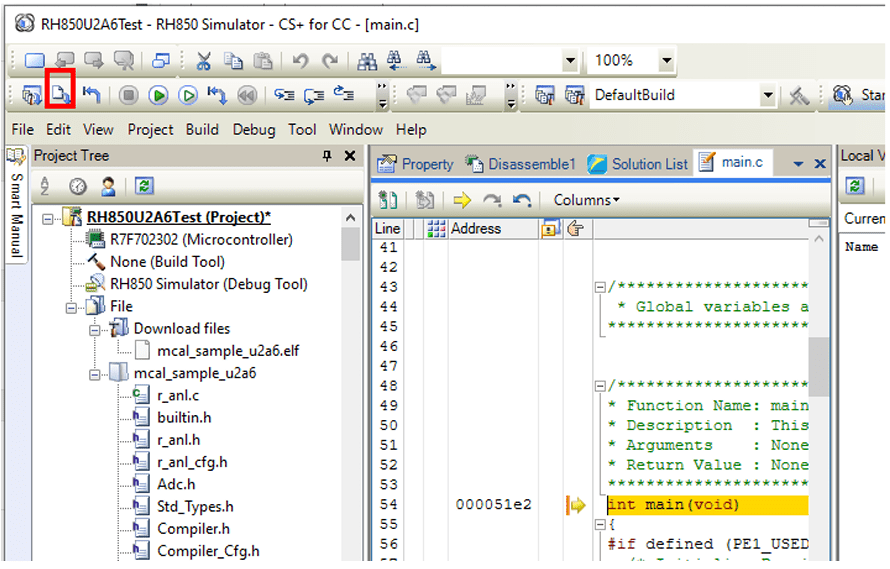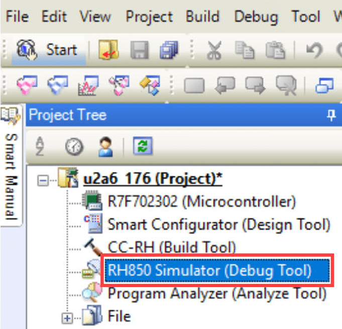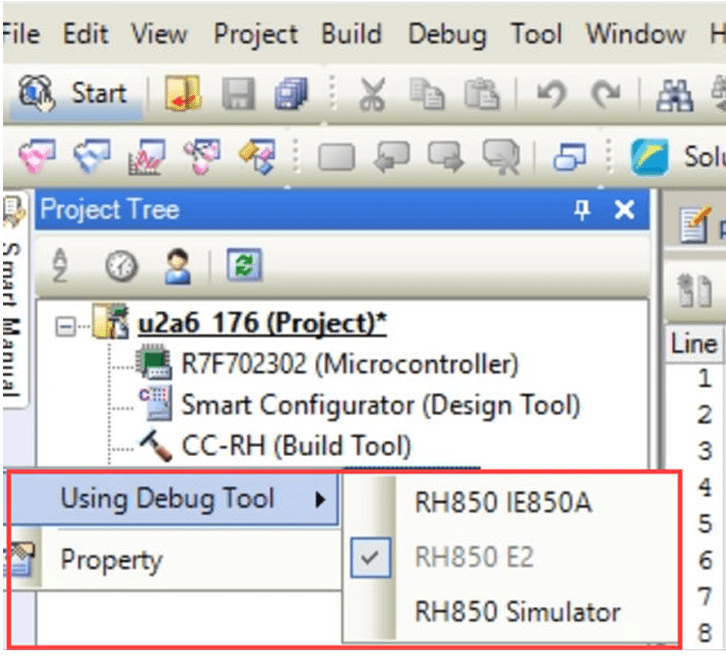 7. In the project tree, right-click RH850 Simulator (Debug Tool) and from the Using Debug Tool option, select RH850 E2.