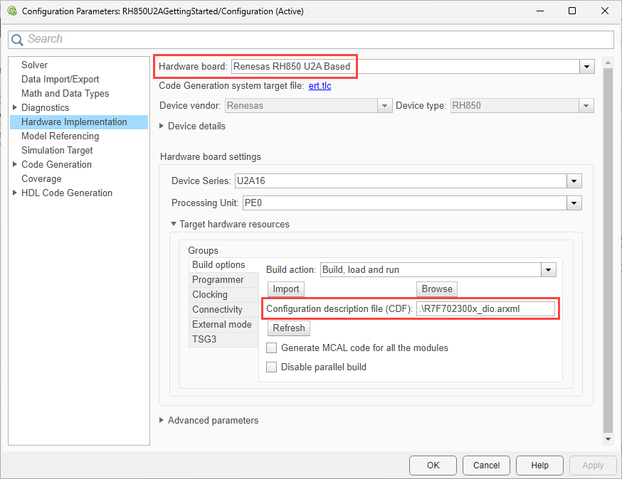 • R7F702300x_dio.arxml is added as the configuration description file in Build options. To verify click Modeling > Model Settings to open the Configuration Parameters dialog box. Navigate to Hardware Implementation > Target hardware resources > Build options.