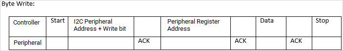 The following image shows a single byte read and write on a register present in the I2C peripheral devices.
