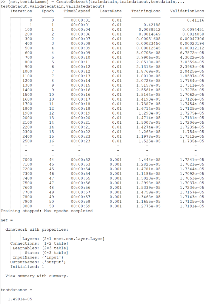 In addition, the utility function displays the training iterations in the MATLAB command window as shown in the following figure: