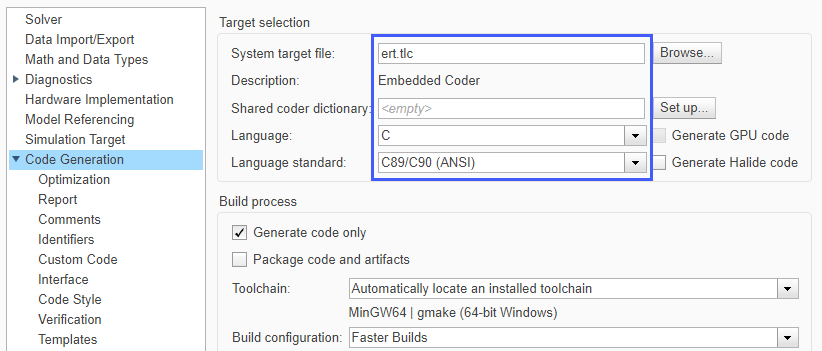 C89/C90 (ANSI).Generate code only — Option to generate an executable after generating the code. For this example, keep the option selected.
