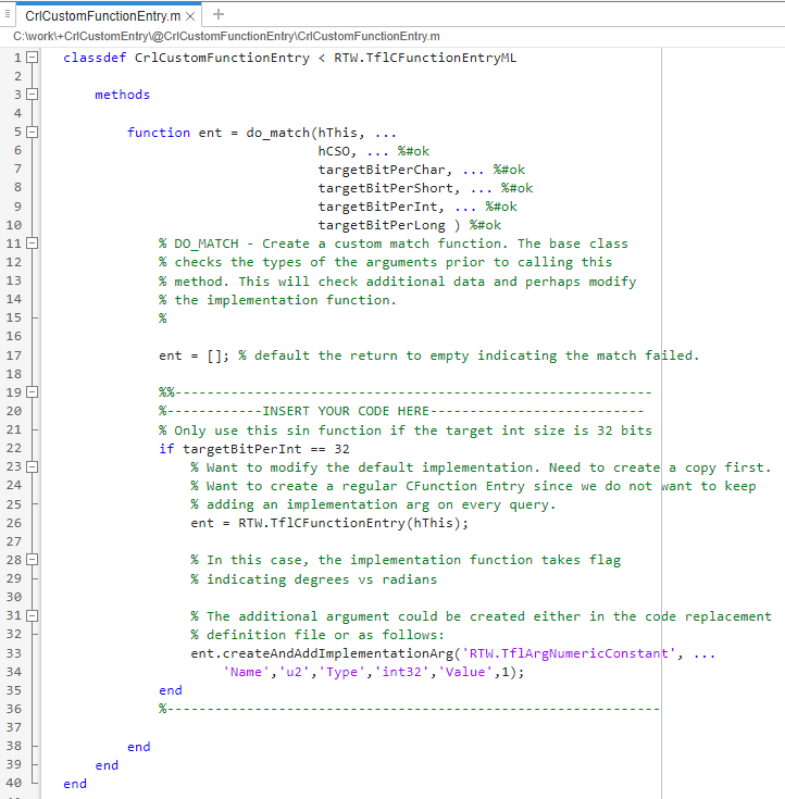 1. Create a custom code replacement entry class, derived from RTW.TflCFunctionEntryML (for function replacement) or RTW.TflCOperationEntryML (for operator replacement).