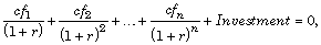 where Investment is a (negative) initial cash outlay at time 0, cfn is the cash flow in the nth period, and n is the number of periods. irr finds the rate r such that the present value of the cash flow equals the initial investment. If all the cfns are positive there is only one solution. Every time there is a change of sign between coefficients, up to two additional real roots are possible.