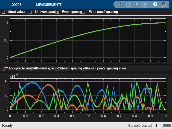 The ideal function and the three approximations are used in the model fxpdemo_approx. Simulate the model.