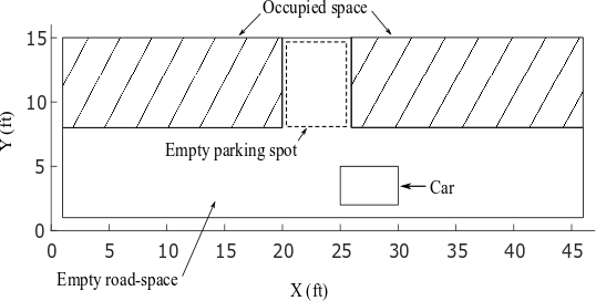 • Due to the constantly changing nature of a parking lot, the kinematic motion constraints, and the physical car attributes, a car does stop at the exact desired position and orientation. Therefore, the parking system assumes that the car stops somewhere in front of the empty parking spot with θ0 or θ180 deg and with unequal space on either side of the car.