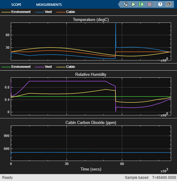 The vehicle HVAC model is adapted from the Vehicle HVAC System (Simscape) example, which models moist air flow in a vehicle heating, ventilation, and air conditioning system.