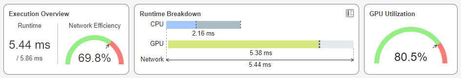 The dashboard summarizes the network execution, runtime, and GPU utilization. Use the Execution Overview, Runtime Breakdown, and GPU Utilization panes to assess the performance of the network.