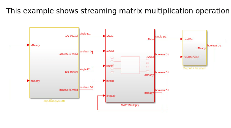 This example model contains three subsystems: InputSubsystem, MatrixMultiply and OutputSubsystem. The InputSubsystem is the upstream module that serializes the matrix inputs(A,B) to the processing module when aReady and bReady signals are enabled. The OutputSubsystem is the downstream module that deserializes the data from the processing module to matrix output(C) when the cReady signal is enabled. The MatrixMultiply is a processing module that implements the matrix multiplication.