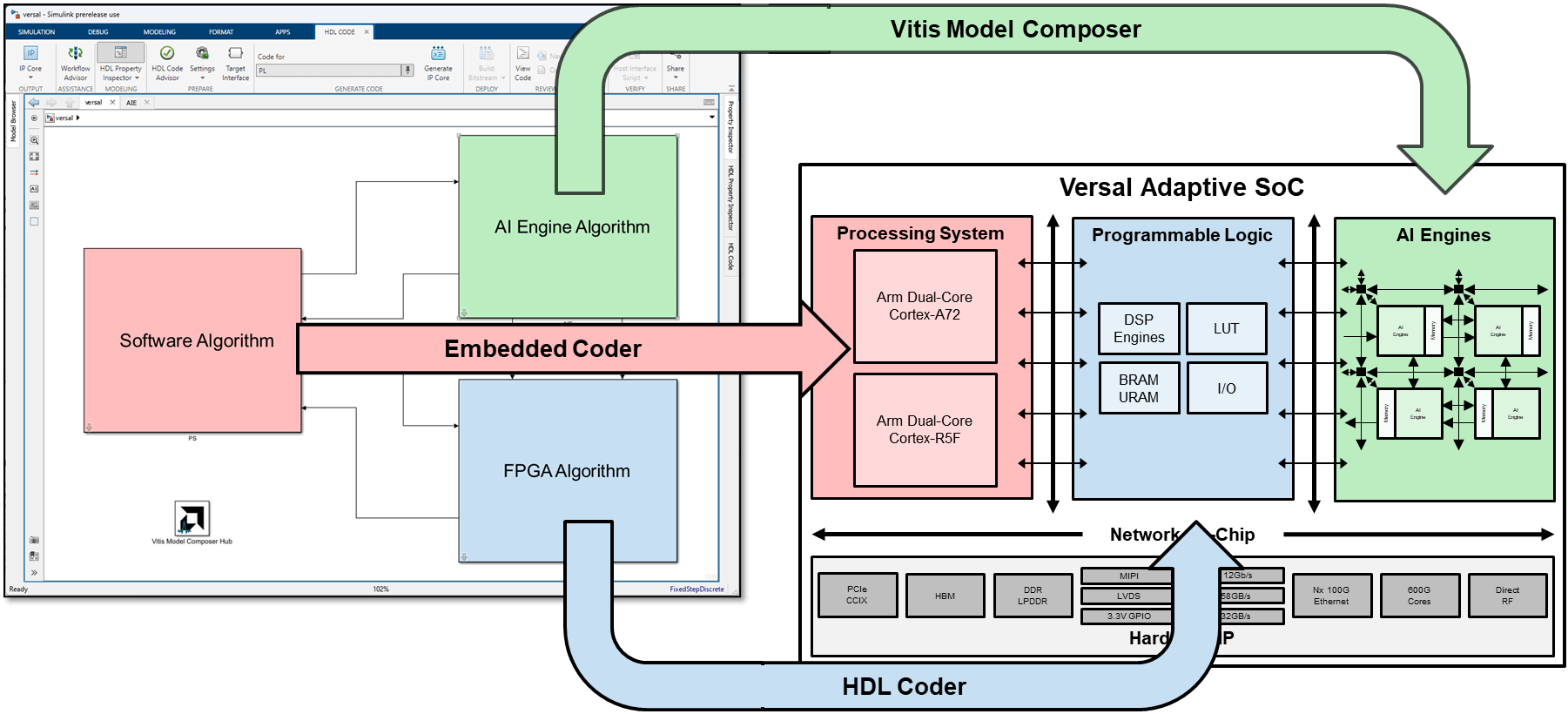 HDL Coder generates optimized HDL code for the programmable logic, such as the FPGA.
