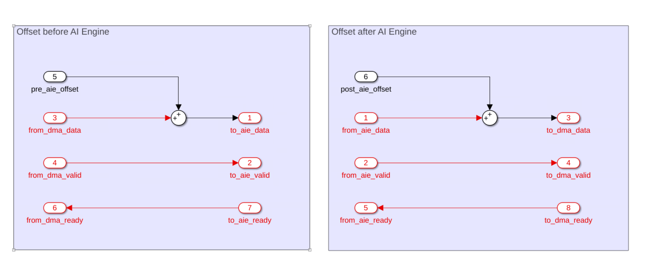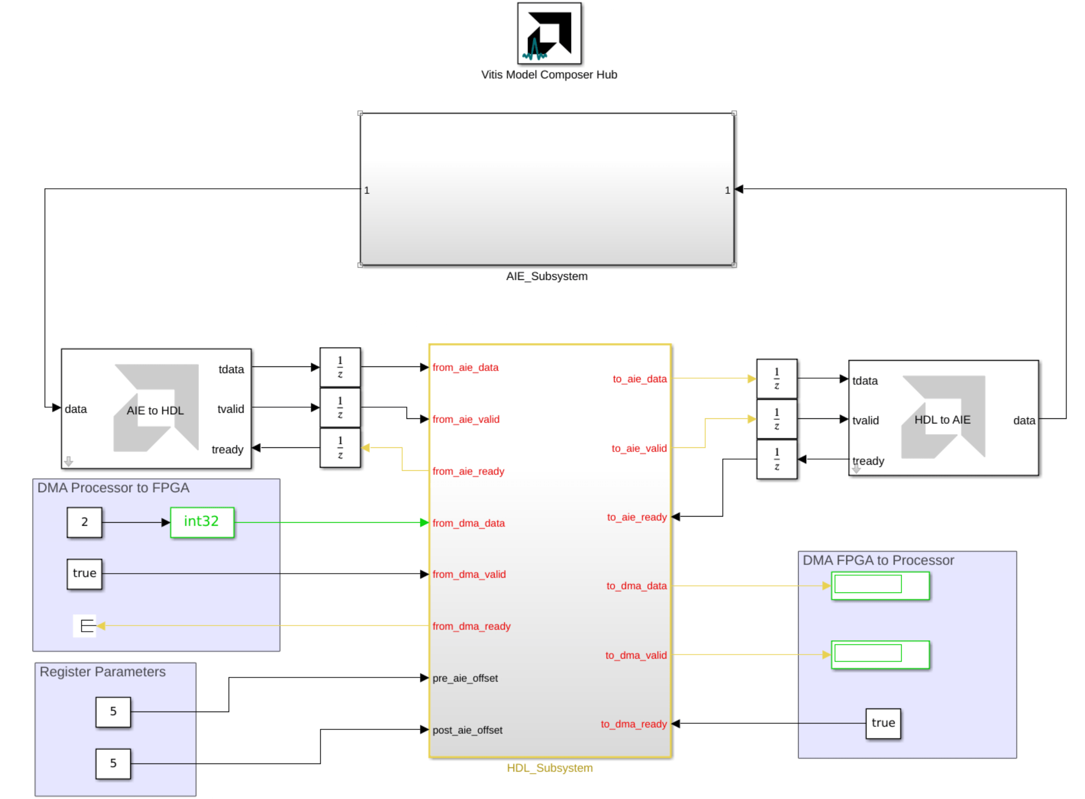 The HDL_Subsystem subsystem contains the algorithm for the FPGA portion of the device. The algorithm uses native Simulink blocks, and it adds an offset to the data before and after the AI Engine algorithm. In the generated code, this offset connects to a register, and you can tune the register values from the software in order to change the offset values.