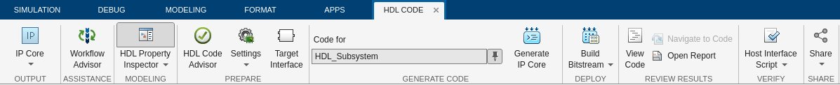 1. In the Apps tab, click HDL Coder. In the HDL Code tab, in the Output section, set the drop-down button to IP Core.