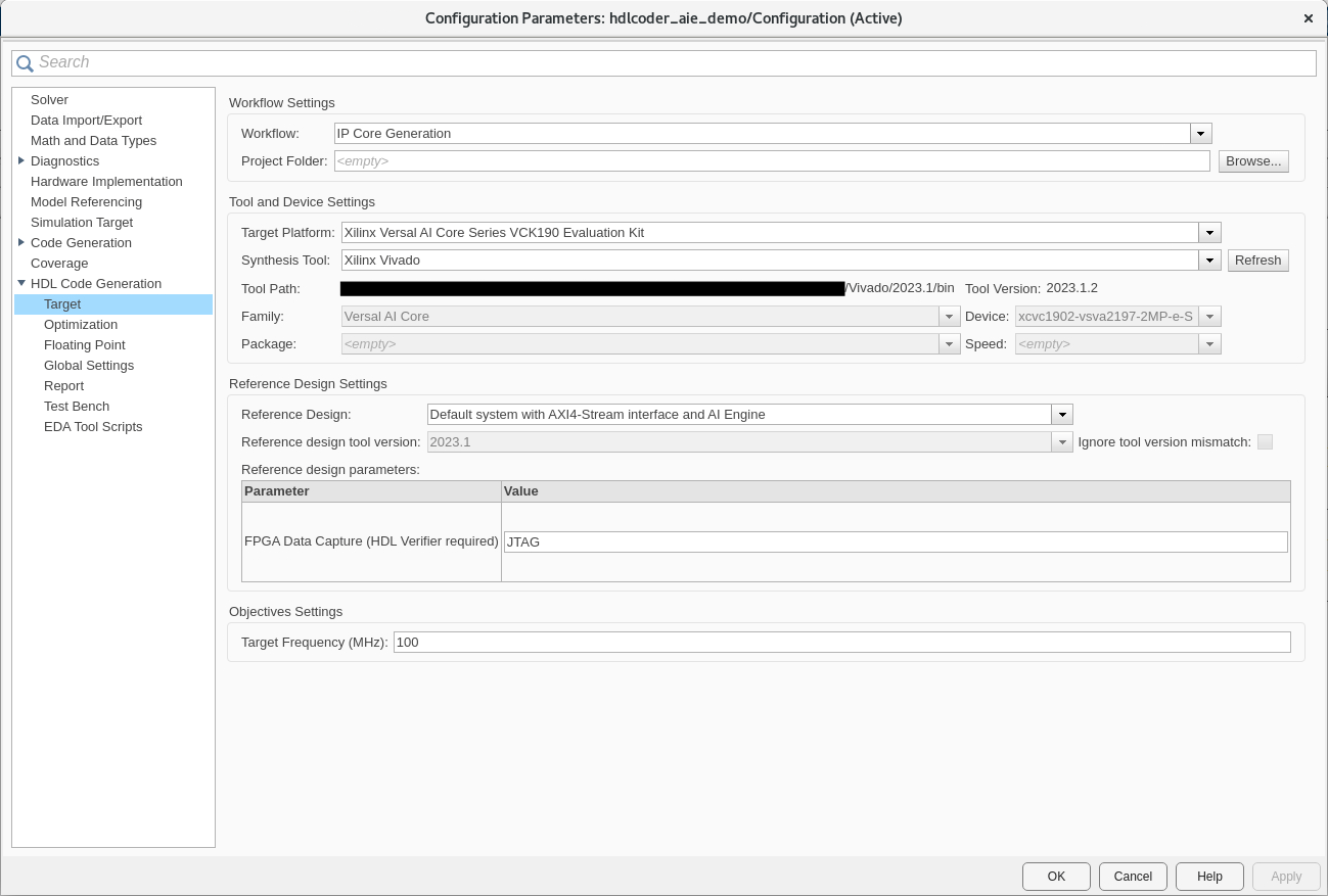 3. Open the HDL Code Generation > Target pane of Configuration Parameters dialog by clicking the Settings button on the toolstrip.