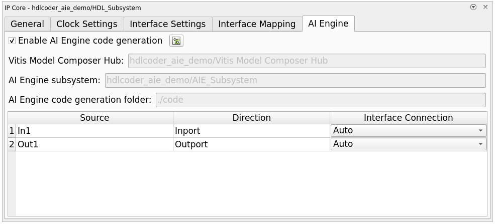 Select Enable AI Engine code generation. After you select the check box, the AI Engine settings populate on the tab.
