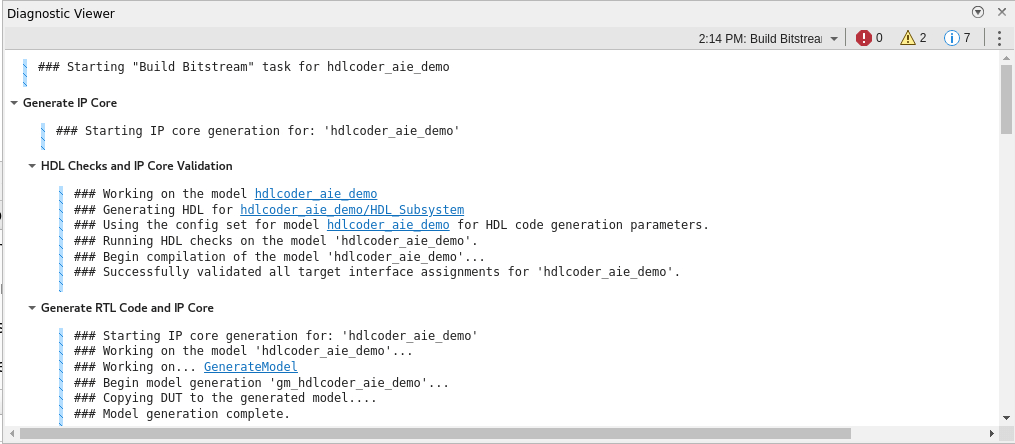 To build the complete system, and generate the HDL IP core and AI Engine code, click Build Bitstream on the HDL Code tab of the Simulink Toolstrip. This action generates the HDL IP core and AI Engine code. The Diagnostic Viewer window displays the code generation progress. After code generation completes, the build process opens an external window, runs synthesis, and creates the programming files. Monitor the external window to determine when the build process completes.