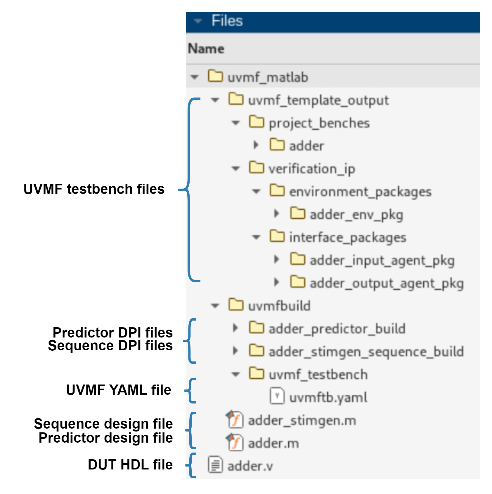 adder.v— DUT HDL file, representing a 16-bit adder. Your DUT can include multiple Verilog or SystemVerilog files. For the requirements of the HDL DUT, see Prepare DUT for UVM Framework Generation.helperExecuteUVMFShellScripts.m(located in thescriptsfolder) —Helper function that executes shell scripts after you generate the UVMF testbench.helperUpdateEnvironmentVariables.m(located in thescriptsfolder) — Helper function that updates UVMF environment variables after you generate the UVMF testbench.adder.m,adder_stimgen.m(located in theuvmf_matlabfolder) — MATLAB files for the predictor and sequence, respectively.MyAdder.slx(located in theuvmf_simulinkfolder) — Simulink model containing the sequence and predictor subsystems.