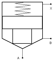 The Cartridge Valve Insert with Conical Seat block represents an insert of a hydraulic cartridge valve consisting of a poppet interacting with the conical seat. The poppet position is determined by pressures at ports A, B, and X and force of the spring. A schematic diagram of the cartridge valve insert with conical seat is shown in the following illustration.