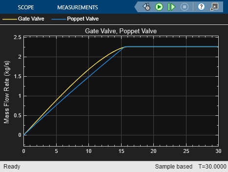 This example uses test harnesses to compare the Gate Valve (TL) and Poppet Valve (TL) blocks. A test harness is a minimum viable model that you can use to parameterize blocks or isolate dynamics.