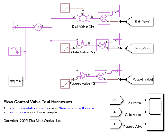 This example uses test harnesses to compare the Ball Valve (G), Gate Valve (G), and Poppet Valve (G) blocks. A test harness is a minimum viable model that you can use to parameterize blocks or isolate dynamics.