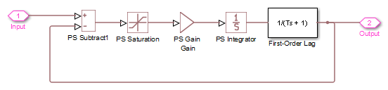 The model of the actuator is built of the Foundation Library Physical Signals blocks: PS Subtract, PS Saturation, PS Gain, PS Integrator. The first-order lag is arranged as a subsystem, as shown below,