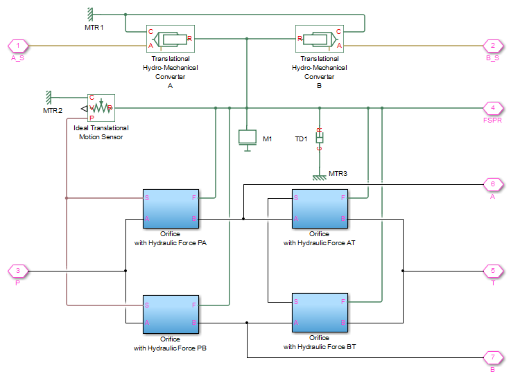 The spool (mass M1, viscous friction TD1) is shifted by the servo-actuator simulated by two Translational Hydro-Mechanical Converter blocks. Connections A_S and B_S are hydraulic ports for applying pilot control pressure.