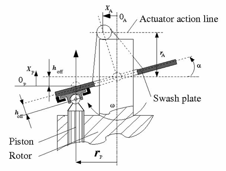 The angular position of the plate is controlled by an actuator, usually a servo cylinder, acting along the actuator action line (marked in the preceding diagram). The distance between the actuator line and the swash plate at zero angle is equal to the actuator arm length rA. The pistons are offset by hoff from the swash plate. The swash plate angle can be changed to increase or decrease the piston stroke. As the rotor turns, the piston slides on the swash plate, which causes the piston to reciprocate. The sliding contact between the piston and the swash plate is maintained by the guideway shown in the diagram.